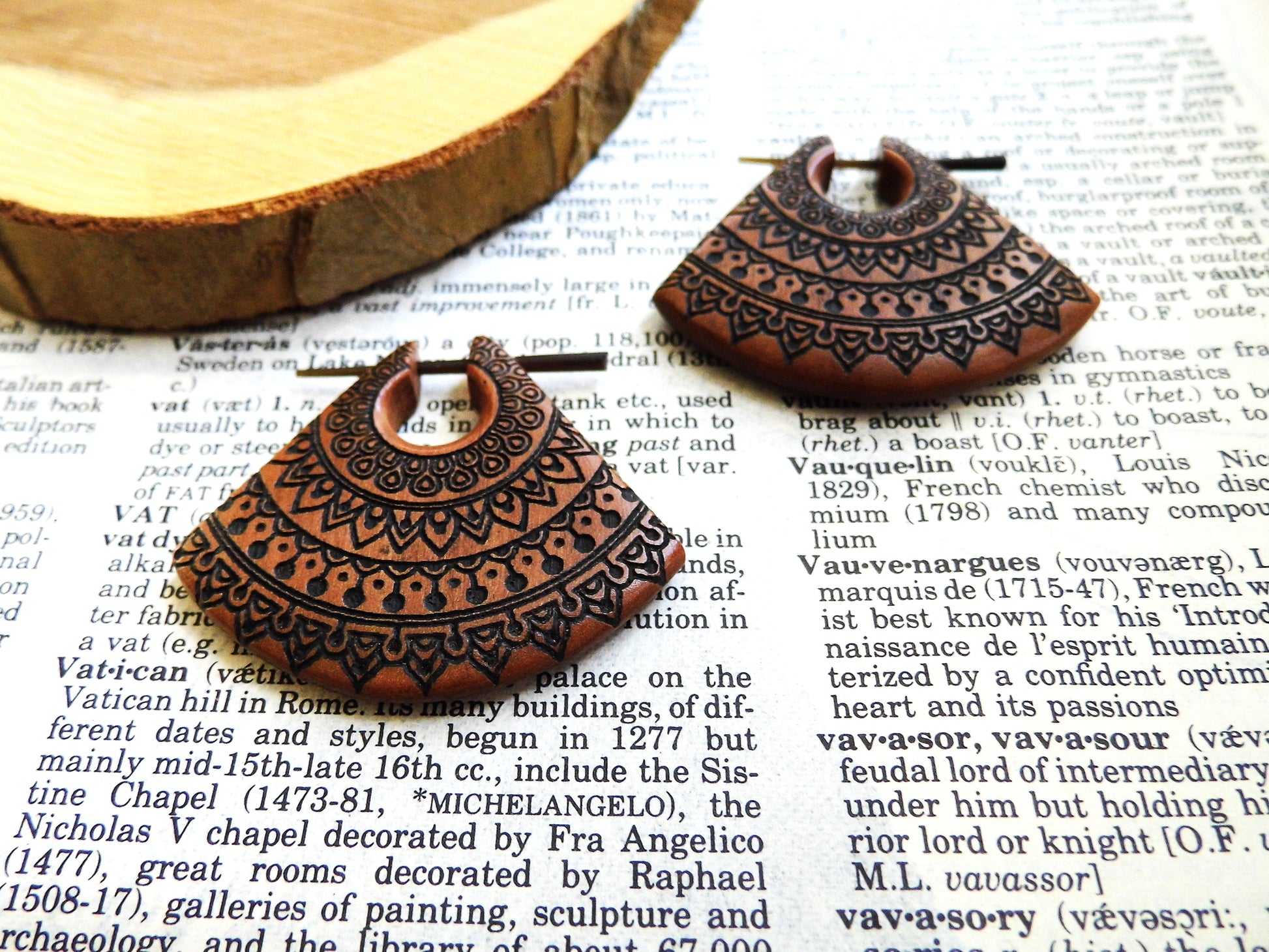 This is an organic natural product, which has been hand turned, then hand finished and/or hand engraved so the earrings can vary slightly from the picture due to these factors. Colour shades can also vary slightly, depending on your monitor