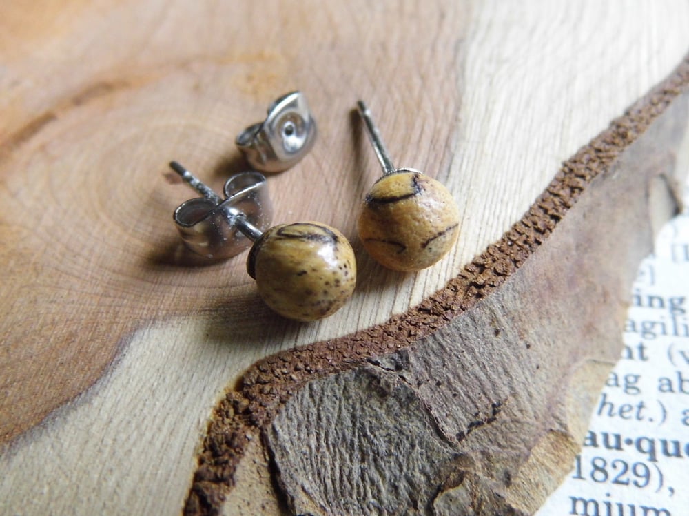 This is an organic natural product, which has been hand turned, then hand finished and/or hand engraved so the earrings can vary slightly from the picture due to these factors. Colour shades can also vary slightly, depending on your monitor